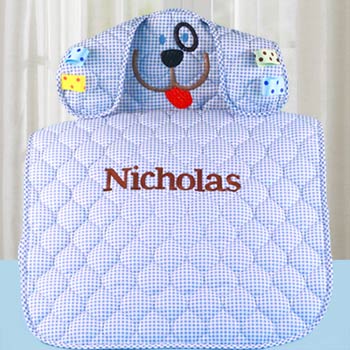 This adorable changing pad is sure to become a favorite for the entire family. The Puppy Changing Pad for Baby Boy is a two-ply 100% cotton quilted fabric that measures 30" tall and 18" wine. With its big floppy ears, this will not only make a great changing pad but also a soft cushion for playing on the floor.
